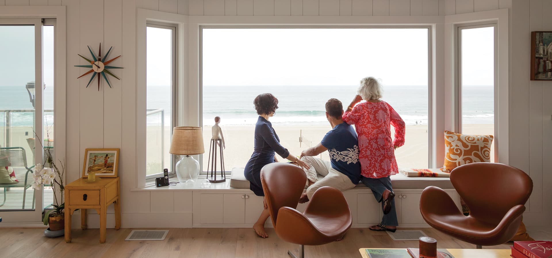 The wood decking outside is built from ipe—a “super-dense, tropical hardwood that doesn’t warp or discolor over time.” This makes the indoor/outdoor entertaining area a durable spot for post-beach happy hours.