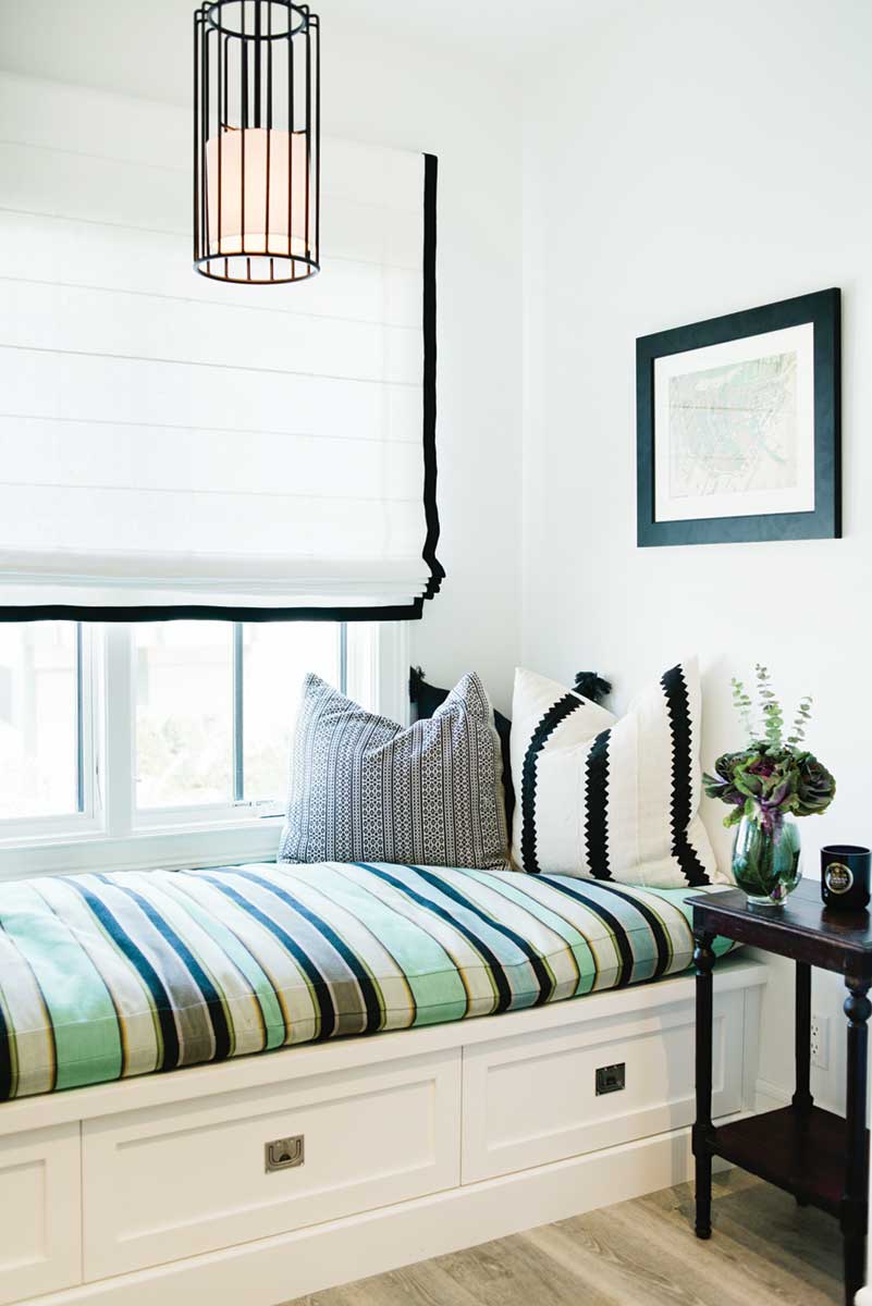 From the moment you walk through the door, you’re struck by the little details and the masterful use of space. Even the entryway serves as a relaxation-nook-meets-storage-area with carefully selected pillows adding a pop of color to the window seat and drawers below for keeping dog leashes neatly tucked away.